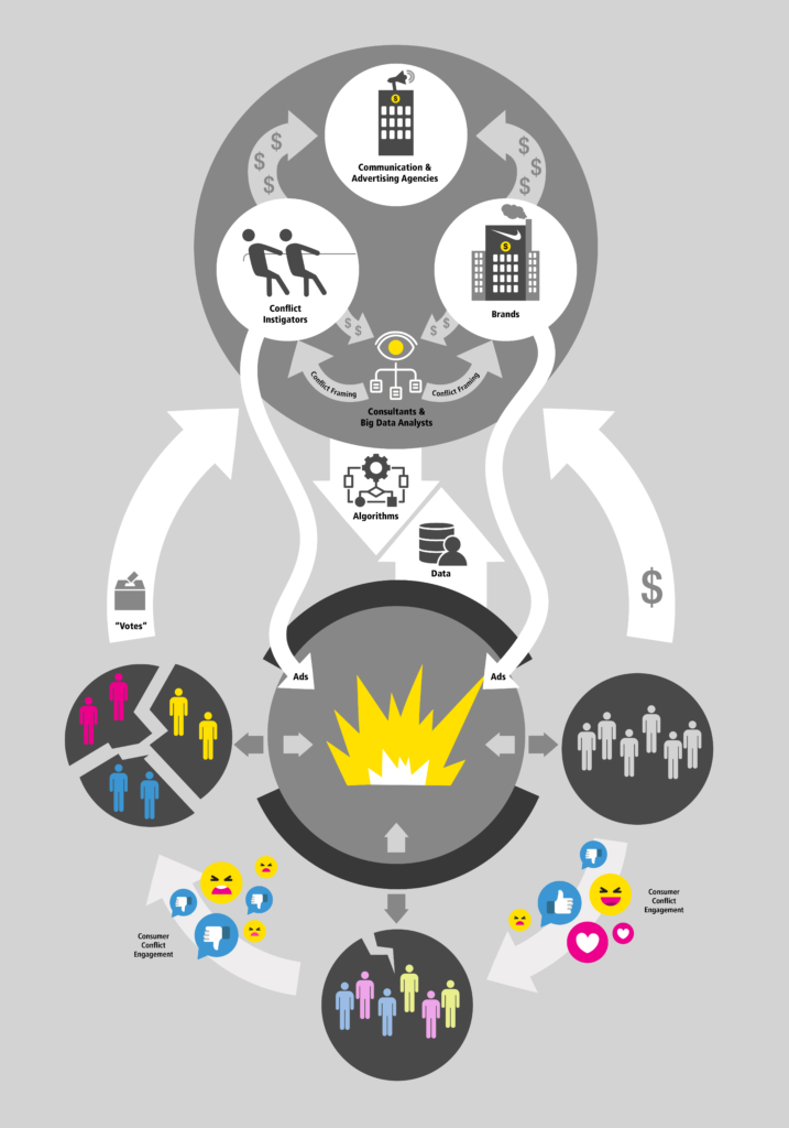 The “Conflict Market” was introduced by Ulver in a Journal of Consumer Culture article in 2022, and is theorized as today’s preferred “business model” where market actors need to orchestrate and escalate affected conflict between consumers to get attention. This ‘capitalization on conflict’ is algorithmically manipulated online, but may collapse into real world polarization and even violence. More philosophically, this ongoing performance is theorized to lead to a more de-dialectic model of social change as compared to Hegel’s dialectic.